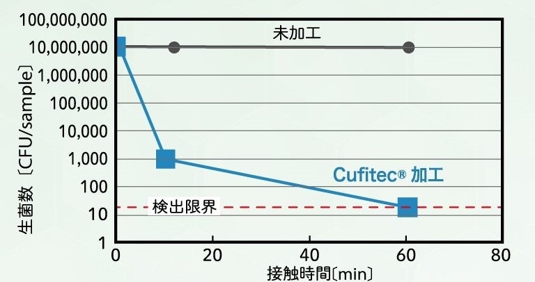 試験方法:Cufitec®加工レーヨン不織布にグラム陰性菌の菌液を滴下し、各接触時間における生菌数を混釈平板培養法を用いて評価した。※JIS L 1902:2015を参考にした試験