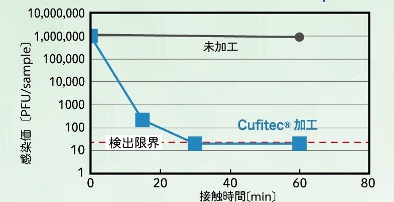試験方法:Cufitec®加工レーヨン不織布にエンベロープがないウイルスのウイルス液を滴下し、各接触時間におけるウイルスの感染価をプラーク法を用いて評価した。※JIS L 1922:2016を参考にした試験