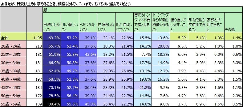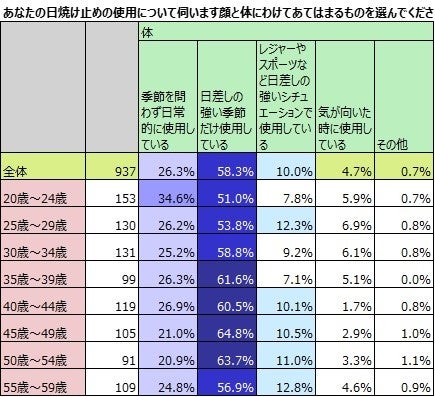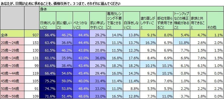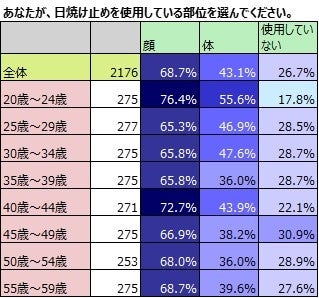 当社が、2021年11月に行った、全国の20歳~59歳の女性対象の調査において、20代女性の約6割が、身体に日焼け止めを使用していることがわかりました。そのうち、34.6%の女性は、季節を問わず、日常的に日焼け止めを使用していることがわかりました。また、20代前半女性は、顔用の日焼け止めで2割、身体用の日焼け止めでも1割を超えて、トーンアップなどの補正機能を求めています。