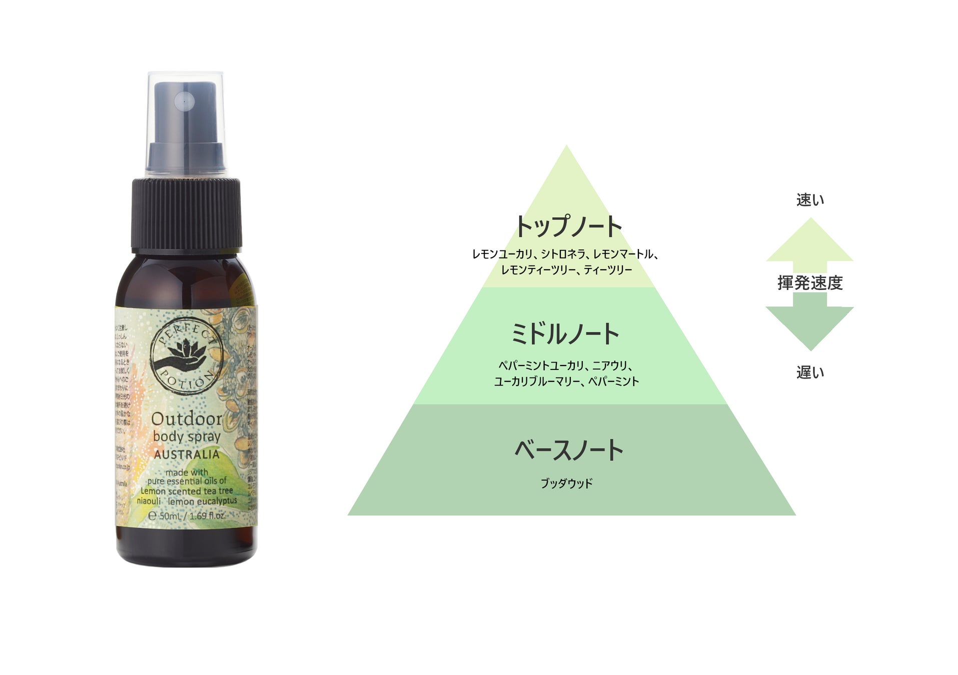•従来の定番ブレンド、アウトドアボディスプレー【エクストラ】に、新しくオーストラリア原産の精油(レモンユーカリ、ティーツリーレモン、ユーカリペパーミント、レモンマートル、ブッダウッド)を加えたNEWブレンドです。