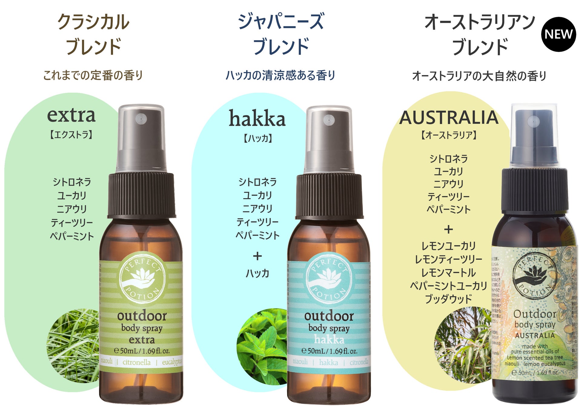 オーストラリア発のオーガニックアロマ&ナチュラルスキンケアブランド パーフェクトポーションを展開するパーフェクトポーションジャパン株式会社(本社:京都府京都市 代表取締役 山本 貴世)は、2022年4月1日(金)※1 ブランド誕生30周年を記念して、夏のアウトドアライフの必需品「アウトドア ボディスプレー」シリーズに、新しく第3の香り[アウトドアボディスプレー オーストラリア]を日本限定で発売いたします。