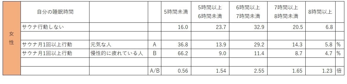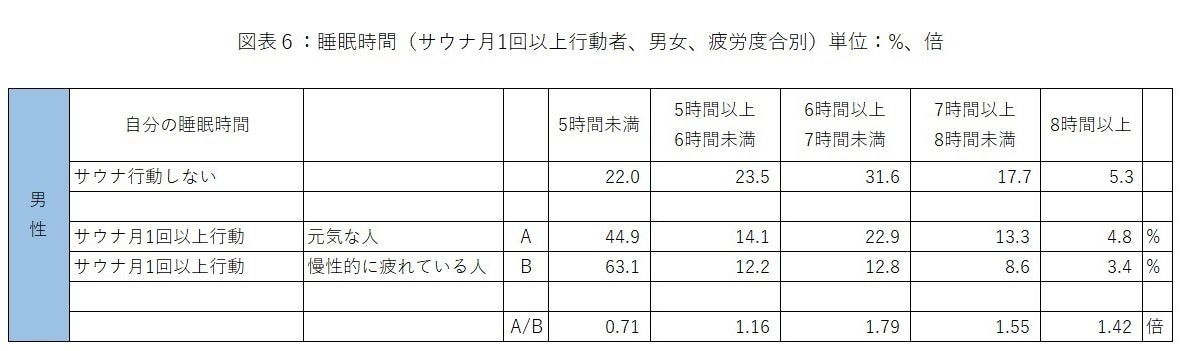 休養時専用ウェアを開発、製造、販売する株式会社ベネクス(所在地:神奈川県厚木市、代表取締役:中村 太一、以下、当社)は、一般社団法人日本リカバリー協会(事務局:神奈川県厚木市、代表理事:片野秀樹)の技術協力のもと、10万人を対象とした「リカバリー(休養)」に関する調査『ココロの体力測定 2021』の情報提供を受け、その研究結果からサウナの実践と休養状況の関係に着目しデータ分析を行ないました。その結果、サウナ利用者すなわち「サウナー」の慢性的に疲れている人は睡眠時間が短いという問題点があることがわかりました。