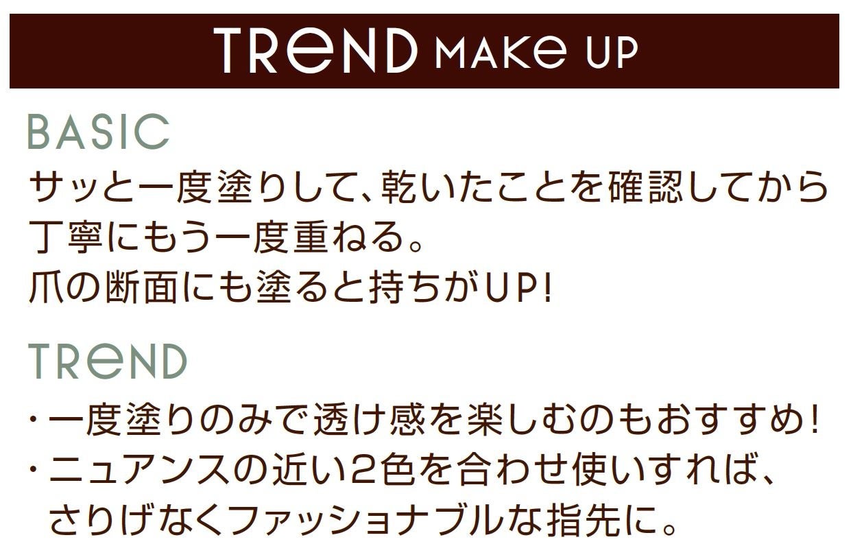 「エクセル ネイルポリッシュ N」は、ファッショナブルでありながらも毎日使いやすい、繊細なカラーにこだわったビューティネイルです。2019年3月の発売以来、大変ご好評をいただいています。光を取り込む透明感のある発色なので、一度塗りでトレンド感のあるシアーな仕上がりに、二度塗りで見たままの色に。塗り方次第で異なるニュアンスを楽しめます。また、お肌や仕草を綺麗に見せる仕上がりの美しさだけでなく、速乾性、落としやすさ、ネイルケア効果など、トータルに爪を美しく見せることにもこだわりました。