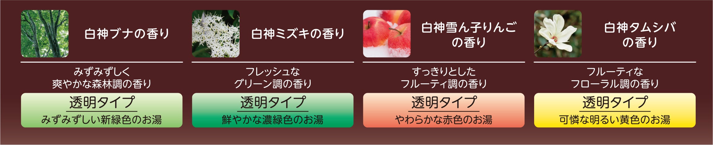 「白神ブナの香り」は、爽やかさの中に木々の温もりを感じる香り。「白神ミズキの香り」は、フレッシュなジャスミン調のグリーンフローラルな香り。「白神雪ん子りんごの香り」は、甘く瑞々(みずみず)しい香り。「白神タムシバの香り」はフルーティーさを感じるフローラルな香りに調整しています。