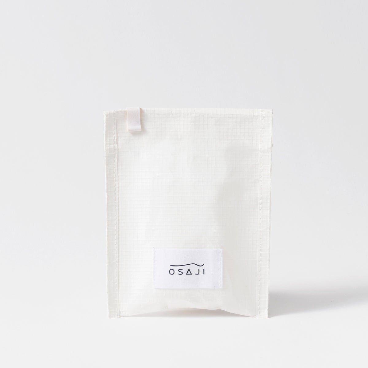 クラフト紙ならではの風合いは、折れやシワもデザインの一部として、OSAJIならではのニュアンスを醸し出しています。中に入れる商品のサイズに応じて、折り曲げてクリップで止めるラフなデザインです。クリップも紙製のクリップを採用しています。