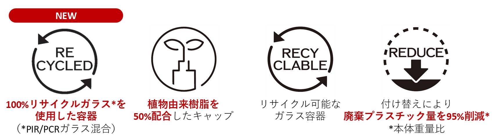 数値情報を追加した既存のサステナビリティアイコンに加え、100%リサイクルガラスを使用した容器である“RECYCLED”アイコンを新たに追加しました。