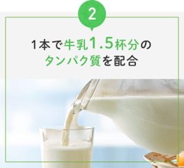 アミノ酸バランスの良いタンパク質、乳由来のホエイプロテイン 10 gを配合。1本で、手軽に牛乳1.5杯分のタンパク質を摂取できます。※牛乳のタンパク質は 1杯200mL あたり 6.8g と計算