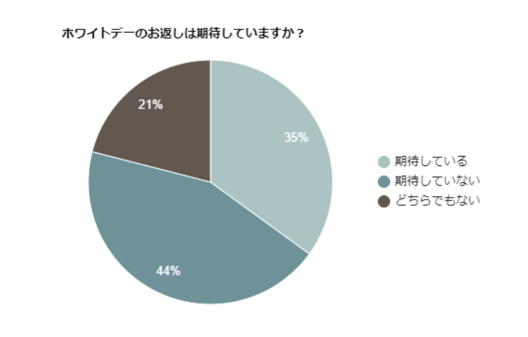 「お返しを期待している」と答えた人は35%で、「期待していない」と答えた人は44%と「期待していない」人のほうが多いという結果だったのです。最近の大人の女性は「見返りを求めない」人が多いということでしょうか。