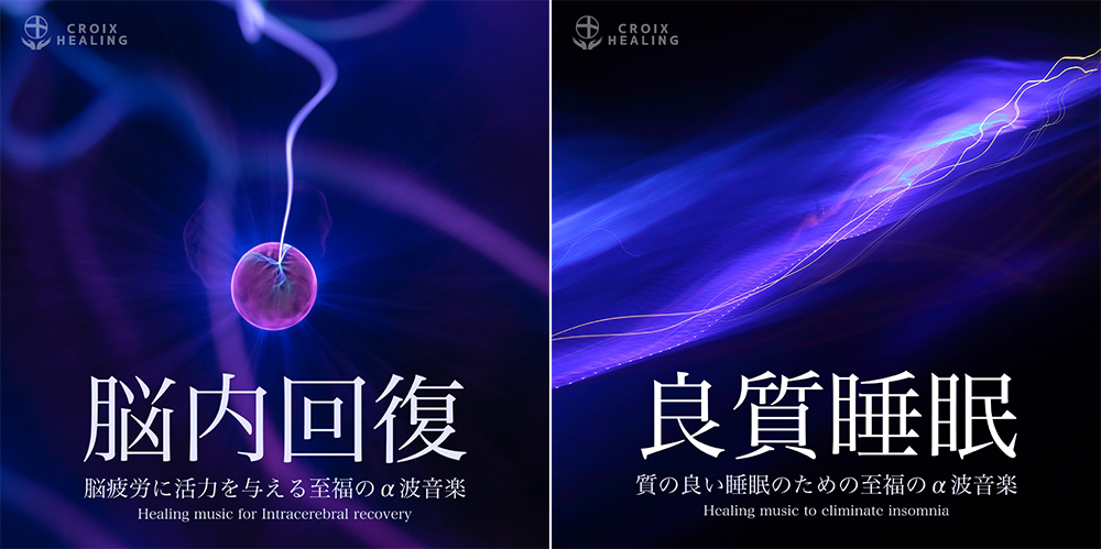 『脳内回復ヒーリング 〜脳疲労に活力を与える至福のα波音楽〜』、『良質睡眠ヒーリング 〜質の良い睡眠のための至福のα波音楽〜』は睡眠途中の覚醒を減らし質の良い睡眠を取ることができ、心地よい朝の目覚めを感じることができる、α波の回復効果による脳疲労の回復に着目し、幸せを感じる心地よい音色で構成された、安定した睡眠を得るために研究された睡眠導入用α波音楽です。