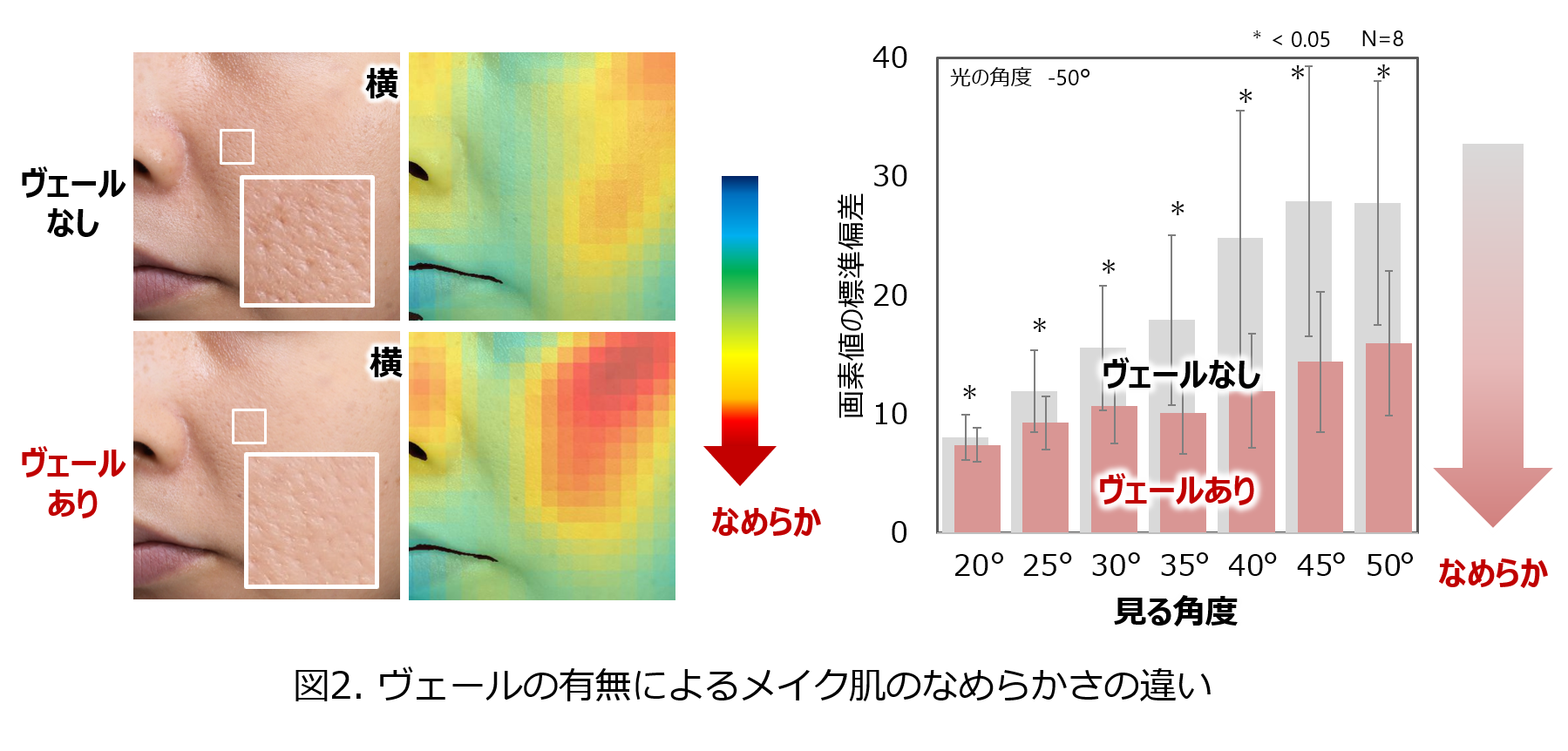 その結果、いずれの指標においても、いつものメイクで肌の凹凸が目立ちやすかった角度で、ヴェールの上からメイクした場合は肌の凹凸が目立ちにくく、なめらかに見えることが示されました(図2)。