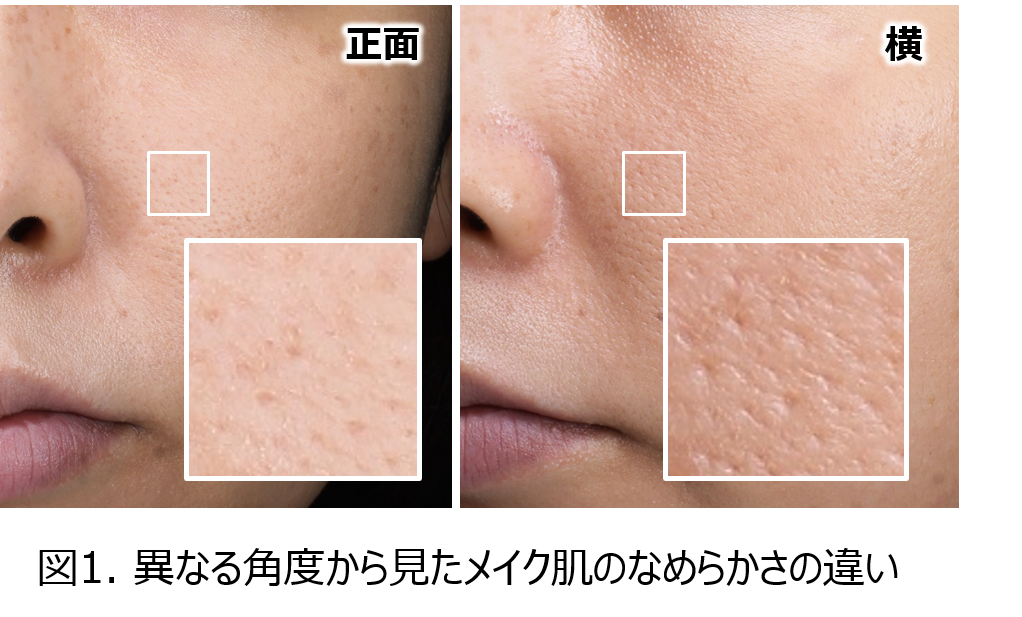 肌には多くの毛穴やきめがあり、平らではありません。そのため、光があたる角度、見る角度によって、毛穴の影が目立ちやすくなることがあります(図1)。