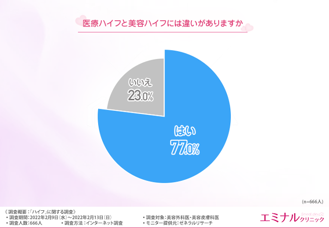 「医療ハイフと美容ハイフには違いがありますか」と質問したところ、8割近くの方が『はい(77.0%)』と回答しました。