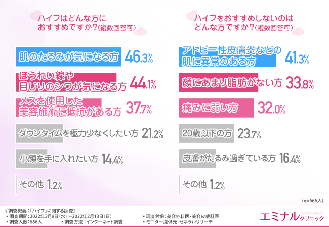 そこで今回、、医療ハイフサービス(https://eminal-clinic.jp/hifu/?refmedia=41073)を提供する医療脱毛のエミナルクリニック(https://eminal-clinic.jp/lp01/?refmedia=11073)は、美容外科医・美容皮膚科医を対象に、「ハイフ」に関する調査を実施しました。