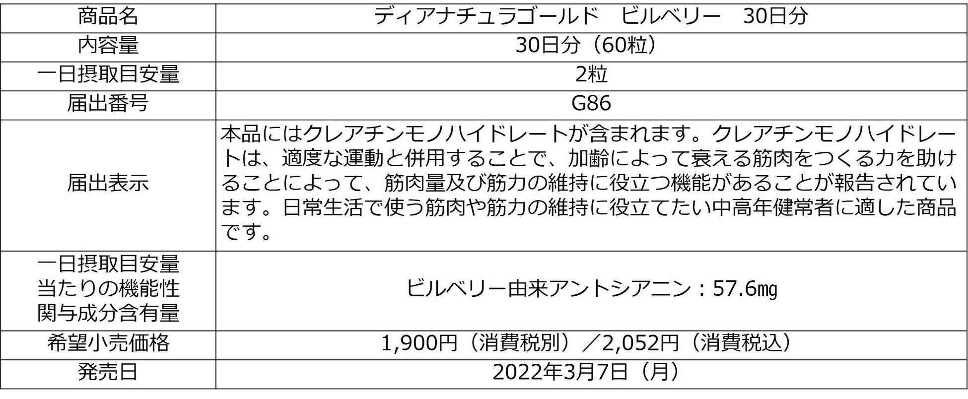 - 機能性関与成分としてビルベリー由来のアントシアニンを2粒当たり57.6mg配合した機能性表示食品です。