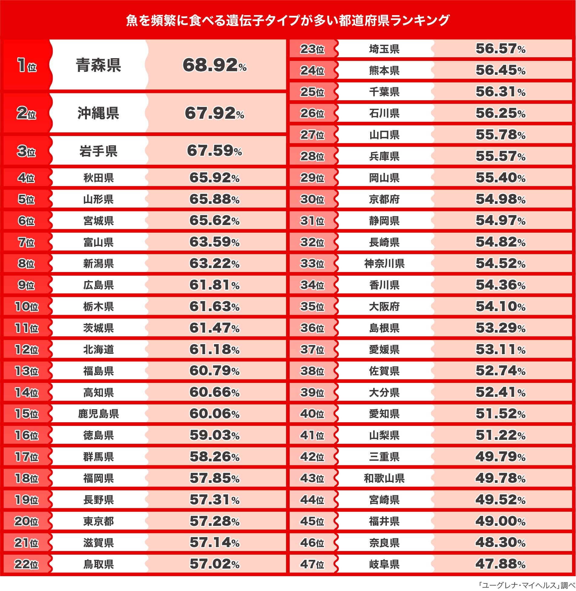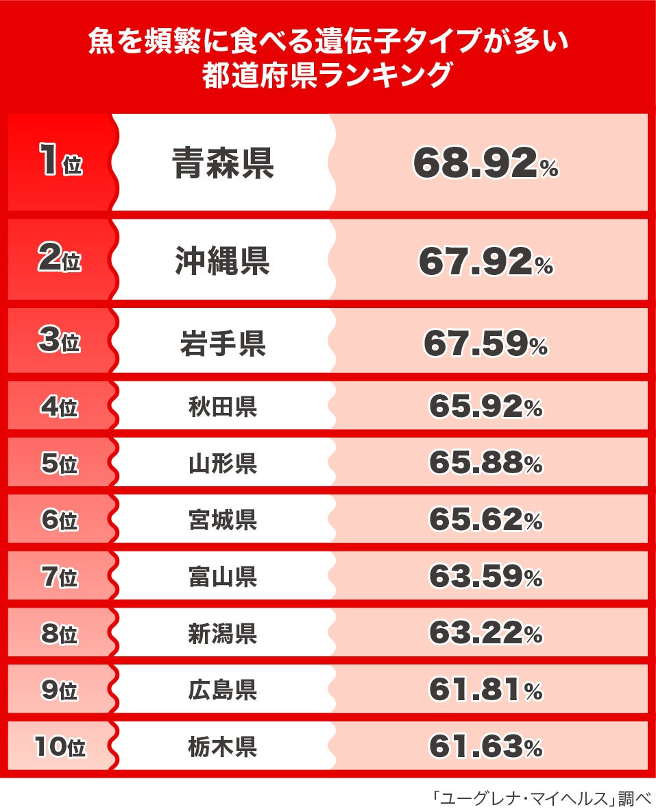 株式会社ユーグレナ(本社:東京都港区、代表取締役社長:出雲充)は、ユーグレナ・マイヘルスとジーンクエストの遺伝子解析サービスのゲノムデータをもとにした、「魚を頻繁に食べる遺伝子タイプが多い都道府県ランキング」を公開いたします。