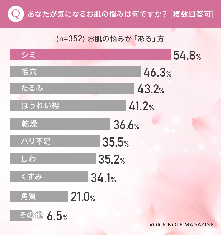 最も多かった悩みは「シミ」で54.8%の方が回答していました。