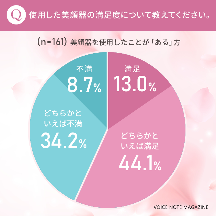 「満足」と回答した13.0%の方と合わせると、57.1%の方が美顔器を使用して「満足」しているようです。