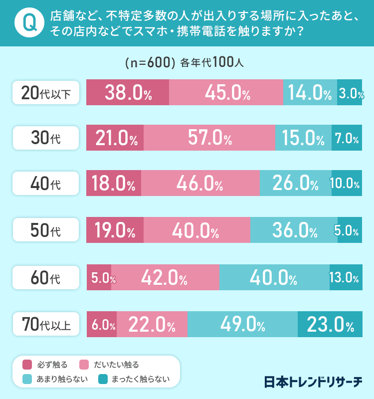 続いて、店舗などの不特定多数の人が出入りする場所に入ったあと、その店内などでスマホ・携帯電話を触るか聞きました。