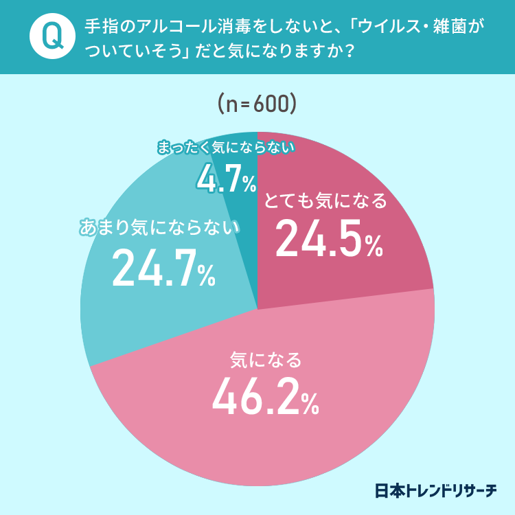 続いて、手指のアルコール消毒をしないと、「ウイルス・雑菌がついていそう」だと気になるか聞きました。
