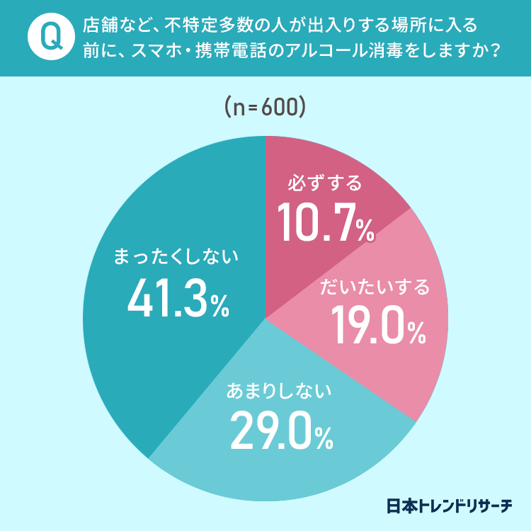 また、「あまりしない」と回答した29.0%と合わせると、70.3%の方は店舗などに入る前にスマホ・携帯をアルコール消毒「していない」ようです。