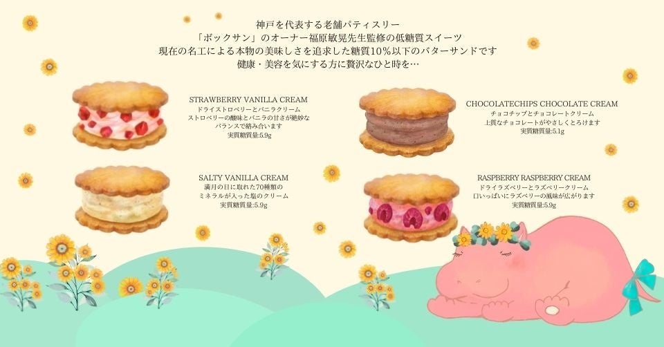 バターサンド以外の低糖質スイーツもすでに企画されており、話題も多く今後の展開が楽しみ。カバの気持ち低糖質バターサンドはすでに昨年10月からオンラインによる販売が開始されており人気上昇中。