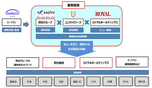 豊富な国内外ネットワークを活用し、「NIKUVEGE」と親和性の高いビジネス機会を創出します。また、強固な畜産品の販売チャネルや高度な加工技術を保有する双日食料株式会社(※)や株式会社ミートワンなどの双日グループの知見を結集し、原材料調達・製造・販売・マーケティング機能を提供することで、業務用のみならず、市販用商品の開発・製造・販売をおこないます。なお本件は、2021年2月15日にロイヤルHDと締結した資本業務提携契約にもとづき実現した取り組みです。