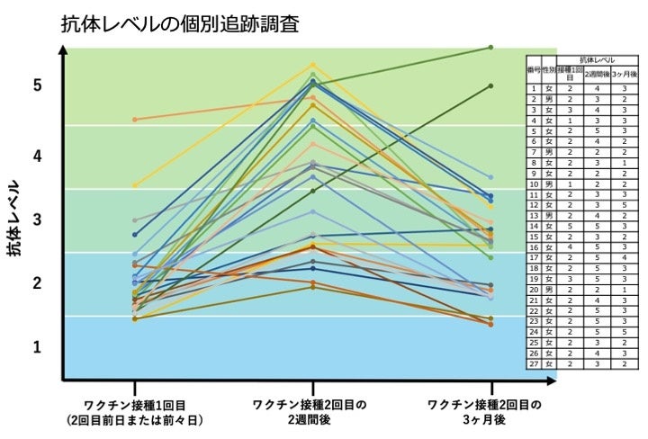 *2:性能試験のために協力者27名の抗体レベルを評価しています。この追跡データではワクチン接種後の抗体獲得量や、その後の抗体量の減少に個人差があることが見られます。
