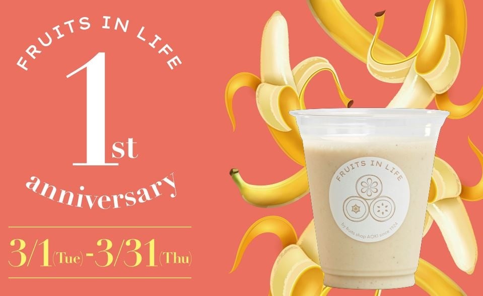 青木フルーツホールディングス株式会社(本社:福島県郡山市、代表取締役会長兼社長:青木信博)が運営するフルーツジュースバー&デリ 「FRUITS IN LIFE」(所在地:東京ミッドタウン)は、2022年3月に開店より1周年を迎えます。これを記念し、2022年3月1日(火)より、バナナミルクスムージーを期間限定の特別価格でご提供するほか、スムージーのブースターを無料でお試しいただけるキャンペーンを実施します。また、併せて2022年3月15日(火)より、季節限定の『さくら香る~塩抹茶ミルクスムージー』を販売いたします。