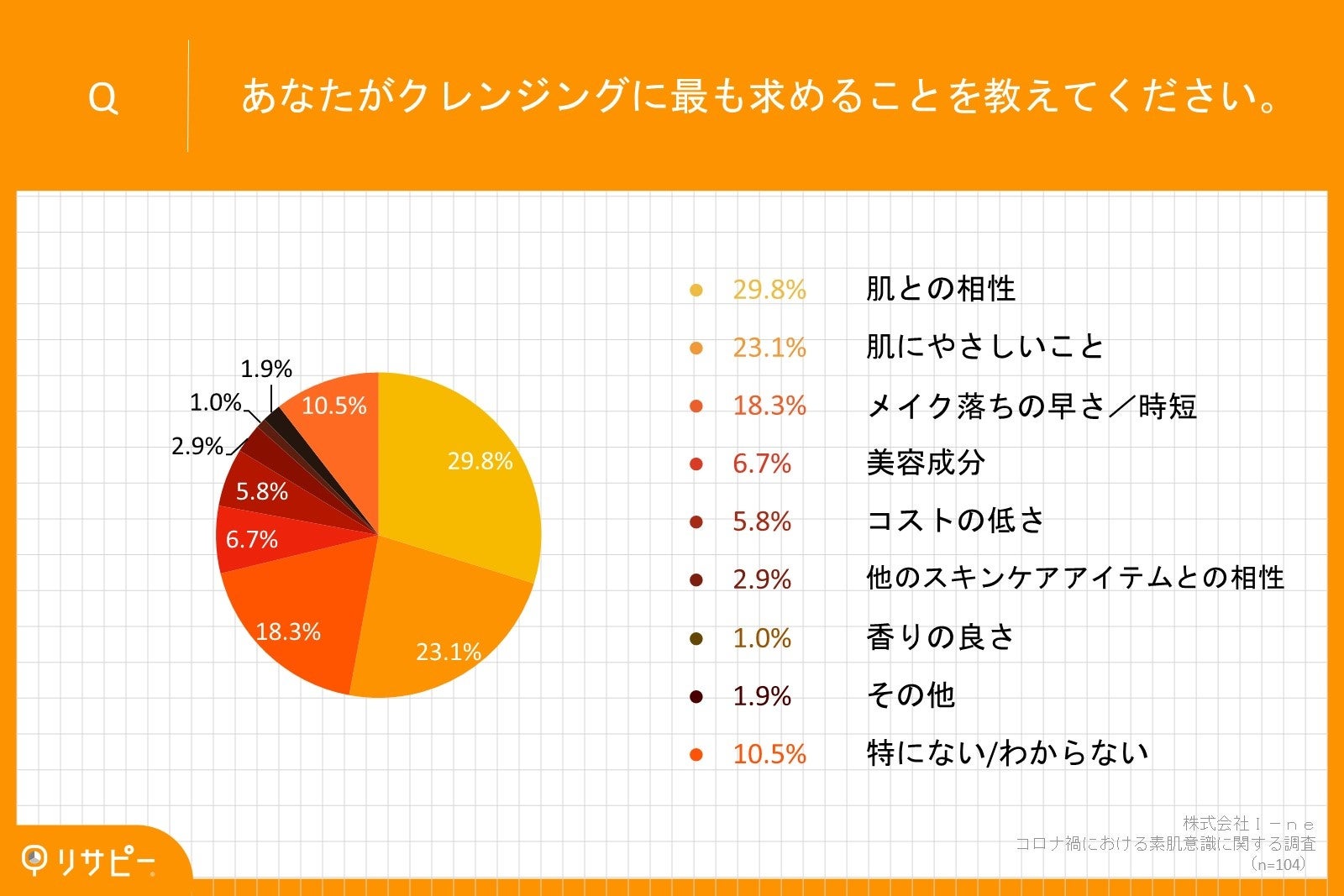 「あなたがクレンジングに最も求めることを教えてください。」(n=104)と質問したところ、「肌との相性」が29.8%、「肌にやさしいこと」が23.1%、「早くメイクが落とせること/時短できること」が18.3%という回答となり、女性にとって肌への“いたわり”がクレンジングを選ぶ上で大切なポイントになることがわかりました。