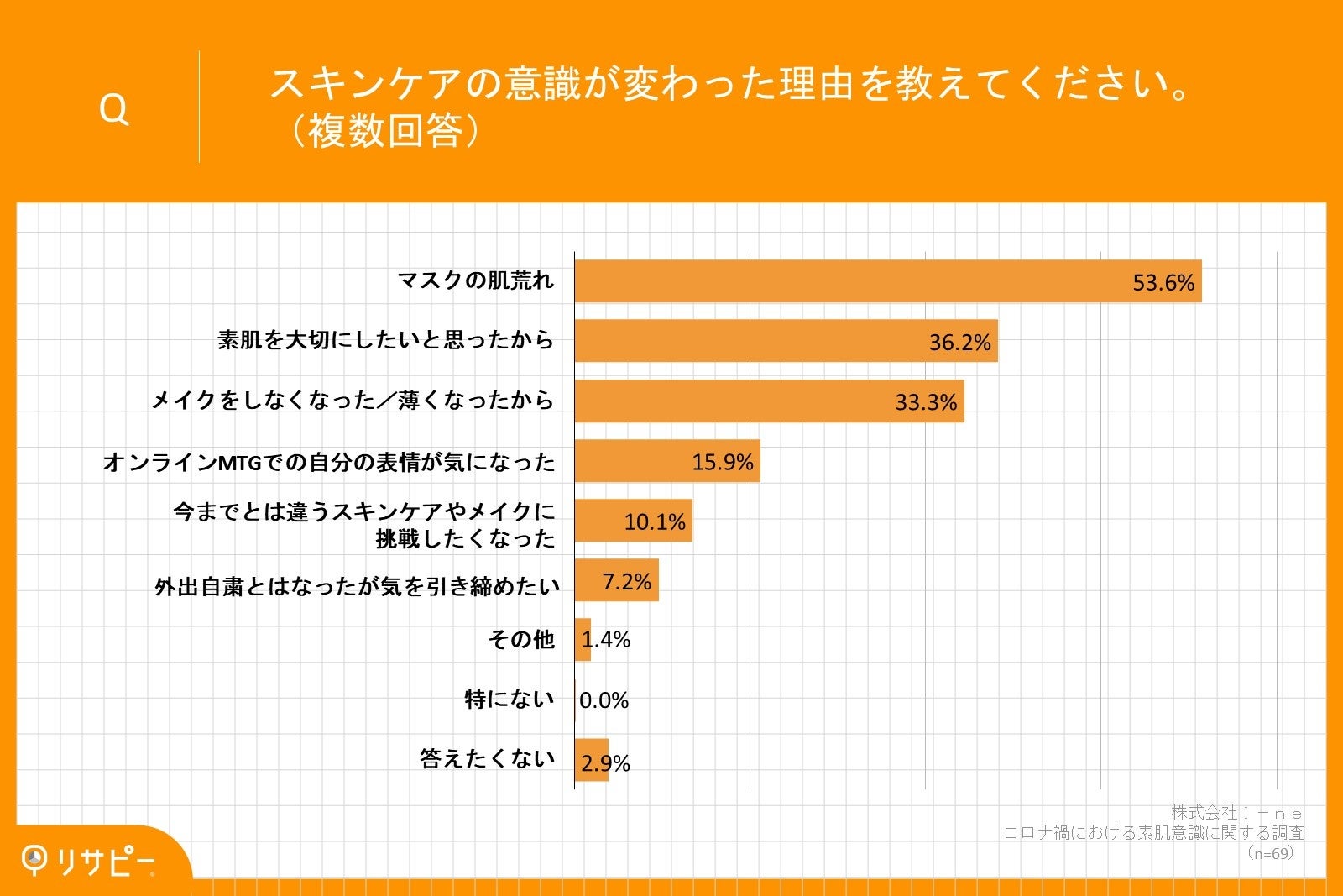 「スキンケアの意識が変わった理由を教えてください。(複数回答)」(n=69)と質問したところ、「マスクの肌荒れ(53.6%)」「素肌を大切にしたいと思ったから(36.2%)」「メイクをしなくなった/薄くなったから(33.3%)」に回答が集まりました。