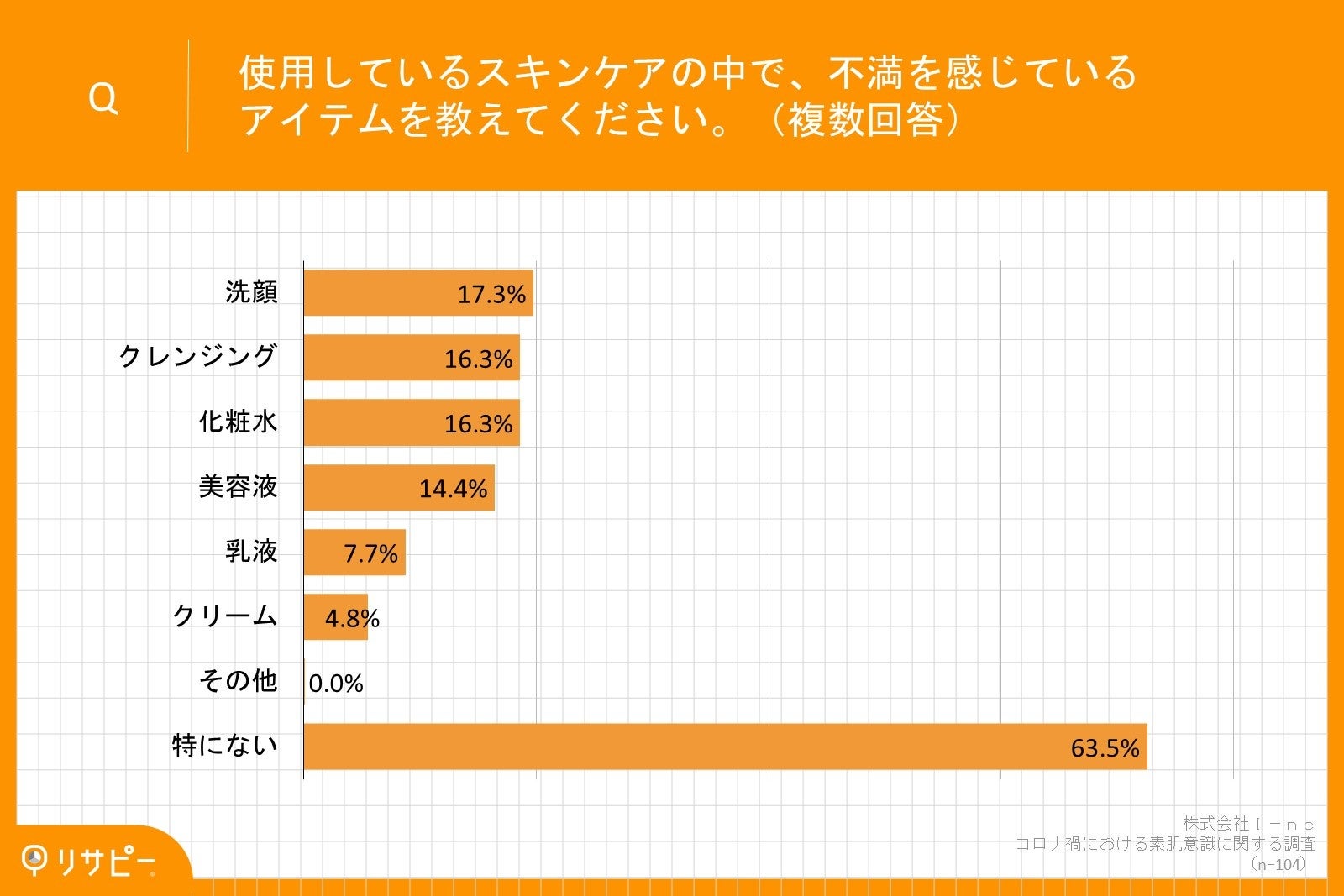 「使用しているスキンケアの中で、不満を感じているアイテムを教えてください。(複数回答)」(n=104)と質問したところ、「洗顔」が17.3%、「クレンジング」が16.3%、「化粧水」が16.3%という回答となりました。