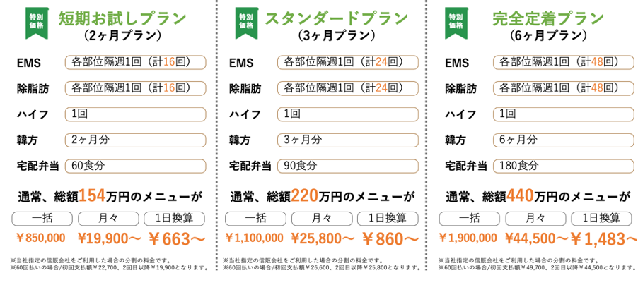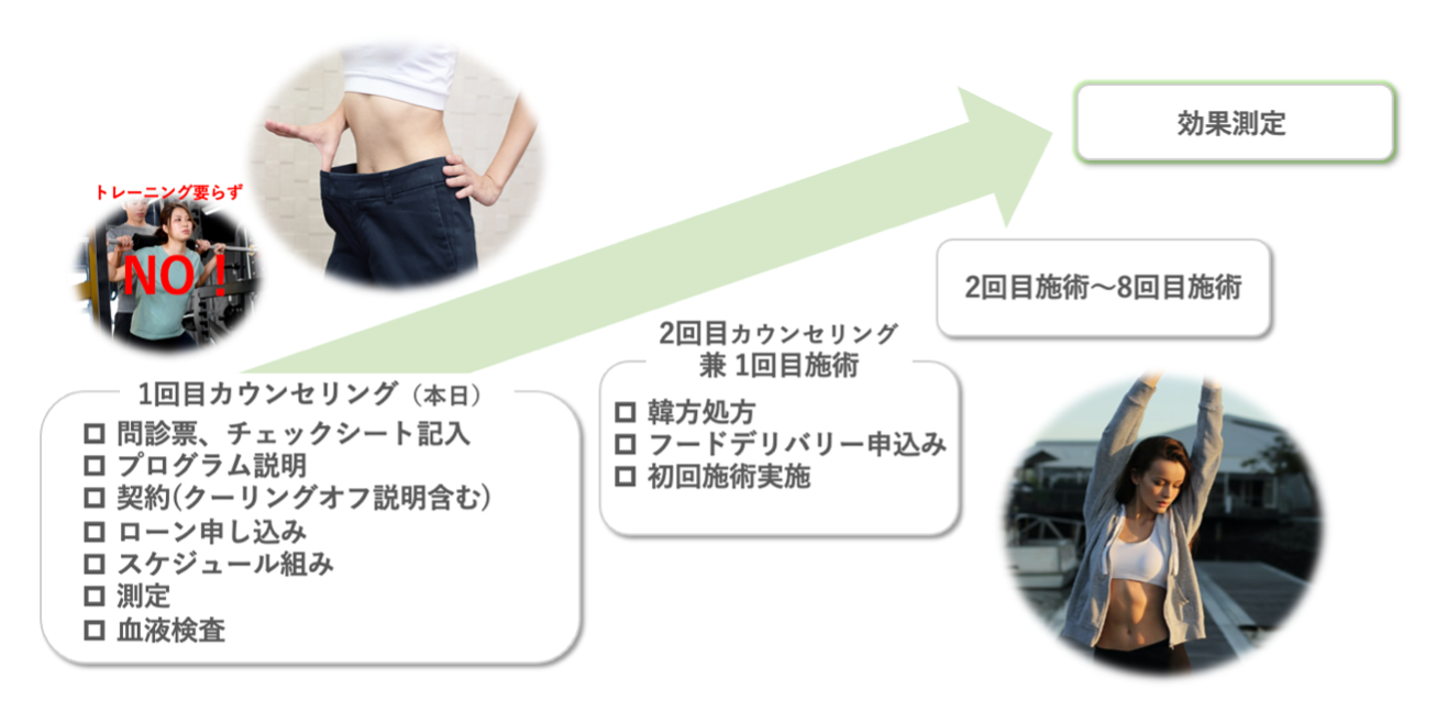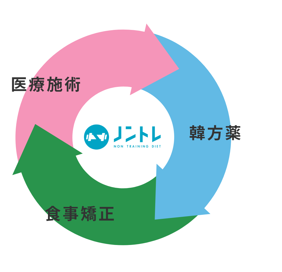 運動一切不要の医療ダイエットプログラム「ノントレ」では、「①韓方で太りにくい体質へ」痩せやすい身体の土台を作る。「②施術効果を最大化」医療施術で身体を引き締め、脂肪燃焼、脂肪除去によりダイエットの実行。「③食事矯正でバイタルを改善」不摂生な生活を抑制し、最適な栄養バランスを保つ。これら3つのサービスの組み合わせで頭を使って賢く、辛く長続きしない運動をすることなくダイエットを実行いたします。一人あたり2ヶ月間〜計8回の施術を行います。