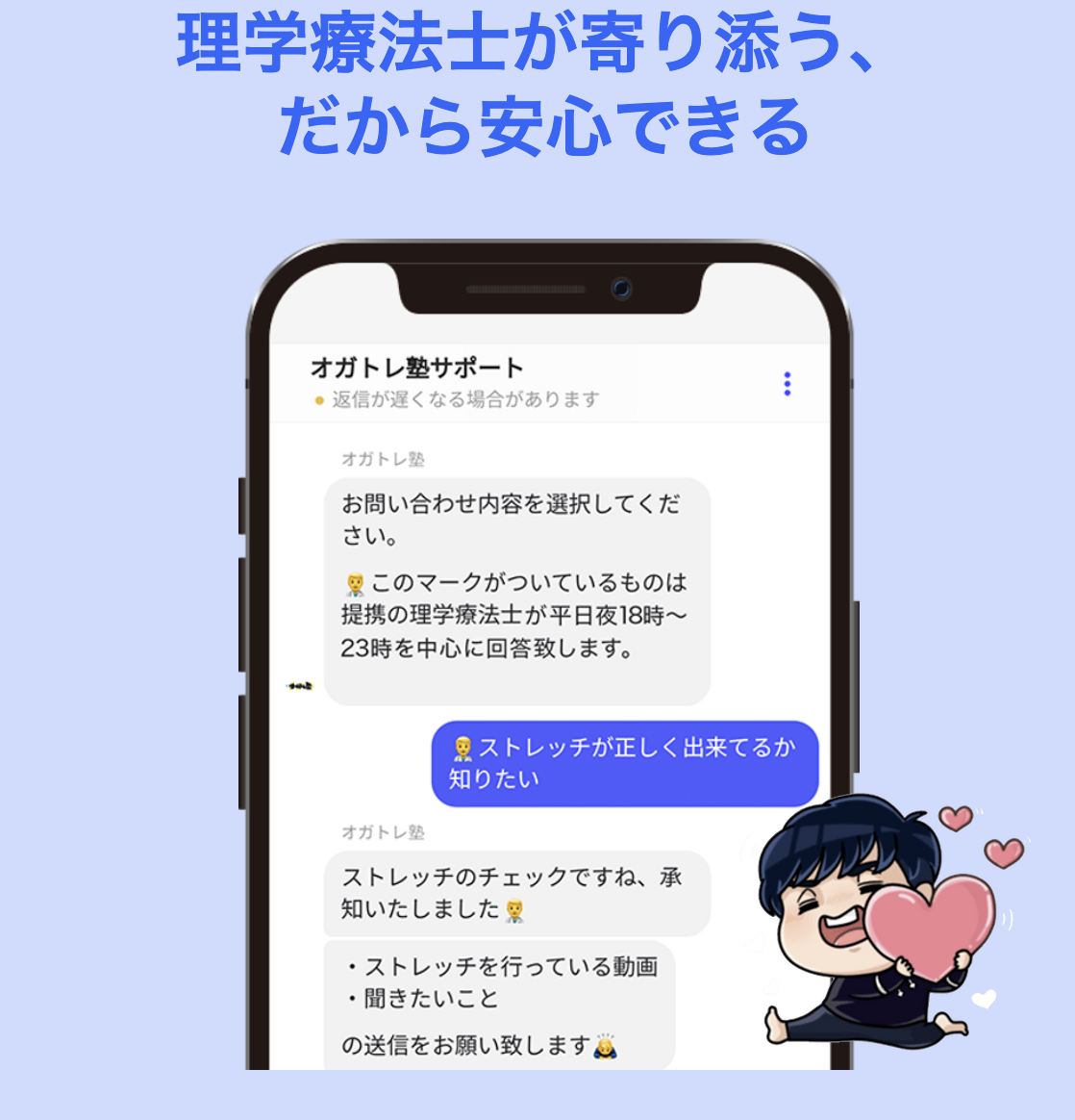 - 提携の専門家に無料個別相談ができる!:提携の理学療法士に1対1のチャット形式でじぶんの身体の相談ができます※秘密は守られます。