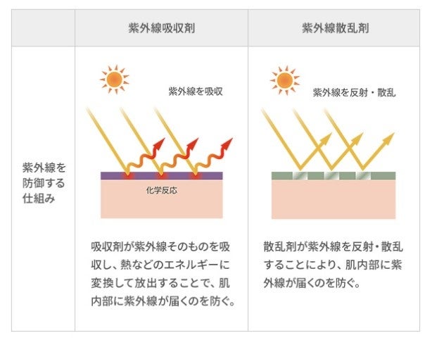 紫外線を防ぐ成分には、「紫外線吸収剤」と「紫外線散乱剤」が