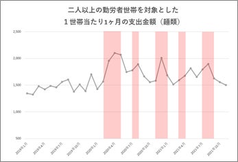 ※麺類にかける支出の推移と新型コロナ第1~5波期間