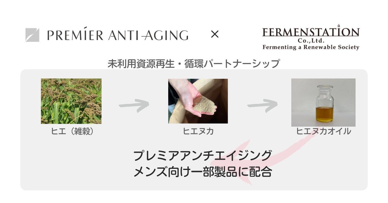 ファーメンステーションがプレミアアンチエイジングと未利用資源 再生・循環パートナーシップ:未利用資源をアップサイクルした化粧品原料の提供を開始、メンズコスメ市場への参入に合わせ「ヒエヌカオイル」を活用