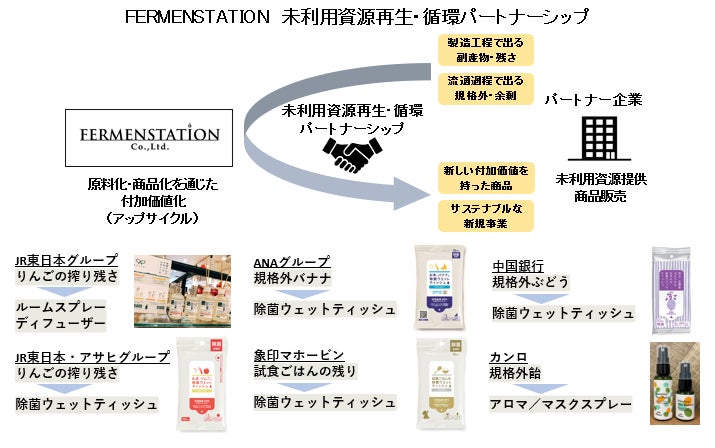 未利用資源 再生・循環パートナーシップ事業として、これまでも、アサヒグループとJR東日本グループが製造するりんごのお酒「シードル」の醸造工程から発生する副産物である「りんごの搾り残さ」や、ANAグループが取り扱う流通過程で汚れや傷みなどにより規格外となり販売できないバナナ、象印マホービンが炊飯ジャーの商品開発において炊飯した際の試食で食べきれないごはん等を活用し、それら未利用資源を発酵・蒸留、精製した「エタノール」を用いたアロマ製品や除菌ウエットティッシュなどを製造・販売するパートナーシップに取り組んでいます。