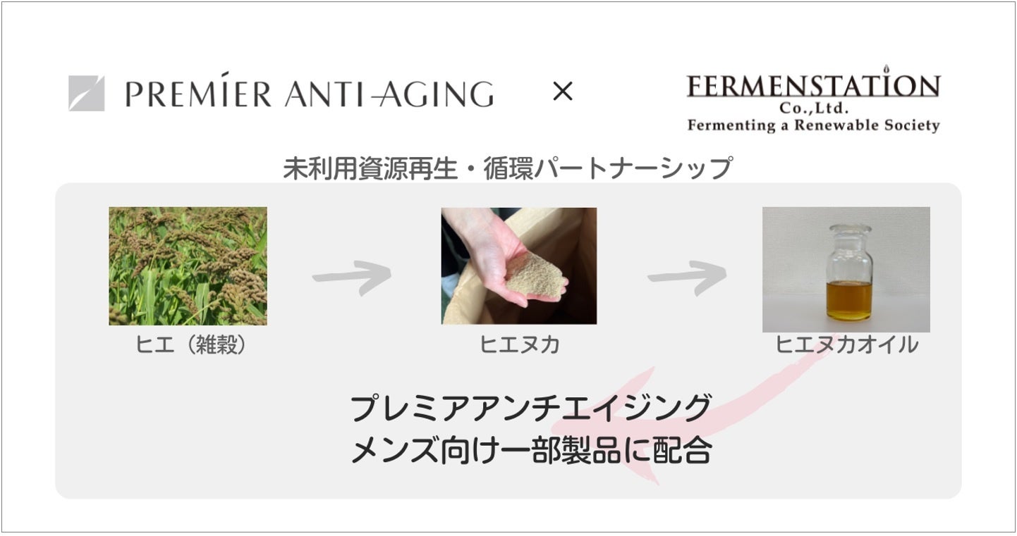 このメンズ向けスキンケアラインにおいて、ファーメンステーションが公益財団法人岩手生物工学研究センター(以下「生工研」)と株式会社JAグリーンサービス花巻プロ農夢花巻事業本部(以下「プロ農夢」)と共同開発したサステナブル原料「ヒエヌカオイル」を一部製品に採用いたします。