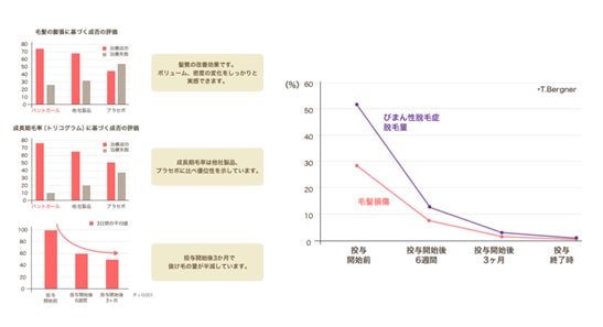 世界で初めて効果が認められたパントガールは、ドイツで開発された脱毛症治療薬です。髪の成長に必要不可欠なアミノ酸、たんぱく質、ビタミンを供給、発毛を促進し、抜け毛を改善します。またパントガールはFAGAや、びまん性脱毛症など女性のあらゆる薄毛の改善に適していますが、女性に限らず男性のAGAにも効果が期待できます。