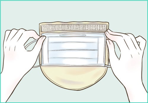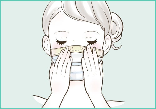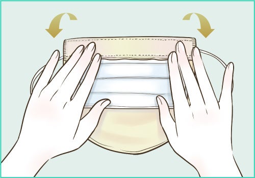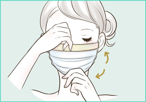 不織布マスクのひだの部分をひっぱり、マスクシートが隠れるように装着します