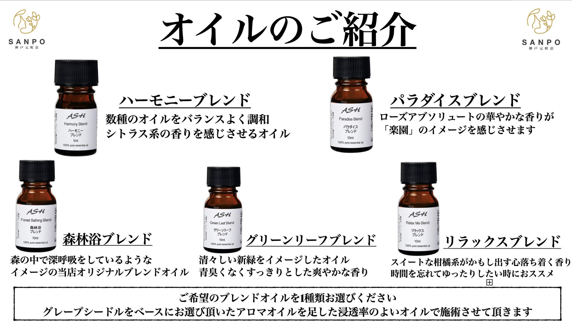 年齢を重ねるごとに変化する心身に寄り添い、優しく・深く・持続する心地の良い圧を丁寧な手技でお客様の身体と心に届けるために作り上げた流れのあるマッサージです。筋肉の緊張を緩めコリをほぐし内蔵機能をアップ、関節の可動域を広げ、身体の中の流れを整えることで本来のご自身のお身体が蘇ります。天然100%のオイル3種類を特別にブレンドして作られたアロマオイルからお好きな香りをお選びいただきます。