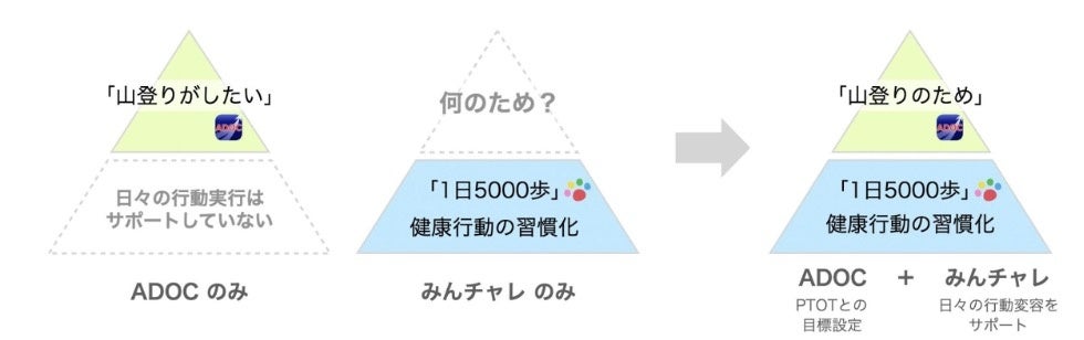 作業療法の目標設定プロセスを支援するためのiPad向けアプリケーションとして開発され国内外で利用されている「ADOC」は、対象者の重要な作業活動の選択は促進されるようになった一方、目標設定後の日々の行動変容が課題となっていました。一方、ユーザー100万人を超える「みんチャレ」は、5人1組のチームで日々の健康行動をオンラインで共有し、ピアグループ内で励まし合い実行することで健康行動の習慣化を図ることができるアプリです。近年では糖尿病患者の運動促進や生活習慣病予防、高齢者の健康行動促進といった1次、2次予防(※2)の医療保健領域への応用も期待されています。3次予防(※2)であるリハビリテーション領域への臨床応用は未検証であることから、本研究では、リハビリテーション患者を対象にADOCで設定した目標を達成するための日々の行動変容を促すための活用・運用について、後方視的かつ探索的に検証することを目的とします。