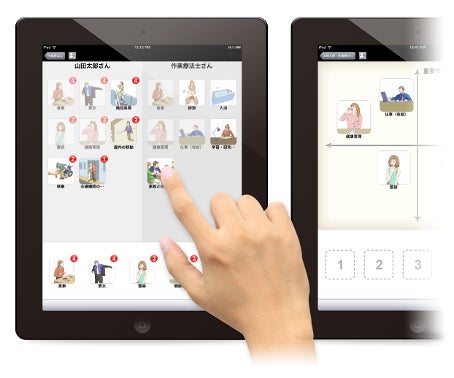 2011年に開発され世界6か国以上のリハビリテーションの現場などに導入されているADOC(Aid for Decision-making in Occupation Choice:エードック)は、作業療法で目標とする作業を決める面接の際、クライエントと作業療法士とのコミュニケーションを促進するためのiPad向けアプリです。ADOCの目的はクライエントと作業療法士の協業を促すことです。ADOCでは、日常生活上の作業が描かれた95枚のイラストを用います。これを、パソコン上でカードゲームをするようにクライエント自身が価値のある作業とそうでない作業に振り分けていくことで、クライエントの意思を引き出します。また、クライエントがイラストを選んだ後、同様に作業療法士もクライエントに必要と思うイラストを選びます。そしてクライエントと作業療法士が十分に協議した上で、作業療法で目標とする作業を決定します。