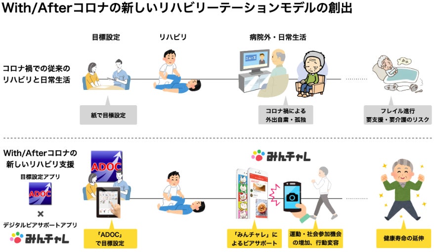 東京工科大学(学長:大山恭弘)医療保健学部とエーテンラボ株式会社(東京都港区、長坂剛代表取締役CEO)は、東京工科大学友利幸之介准教授らの研究チームが開発し、実用化されている作業療法における目標設定アプリ「ADOC(エードック)」と、エーテンラボ株式会社が開発するデジタルピアサポート(※1)アプリ「みんチャレ」を組み合わせてコロナ禍におけるリハビリ患者のサポートに応用するための臨床研究を実施いたします。
