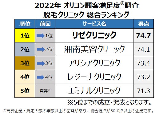 2022年 オリコン顧客満足度(R)調査 脱毛クリニック ランキング