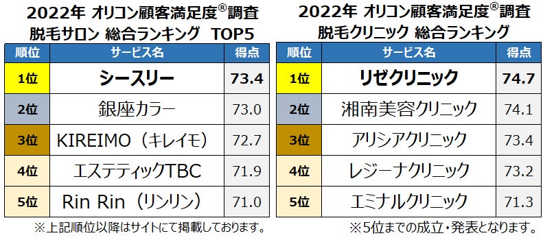 “見えない満足を可視化する”をコンセプトに、第三者の立場で顧客満足度調査を実施する株式会社oricon ME(読み:オリコン エムイー 本社:東京都港区 代表取締役社長:小池恒)は、『脱毛サロン』『脱毛クリニック』についての満足度調査を実施し、2022年3月1日(火)14時にその結果を「オリコン顧客満足度®」公式サイト内( https://life.oricon.co.jp/ )にて発表いたしました。結果は、【シースリー】が『脱毛サロン』ランキングで初の総合1位、【リゼクリニック】が『脱毛クリニック』ランキングで2年連続総合1位を獲得しました。
