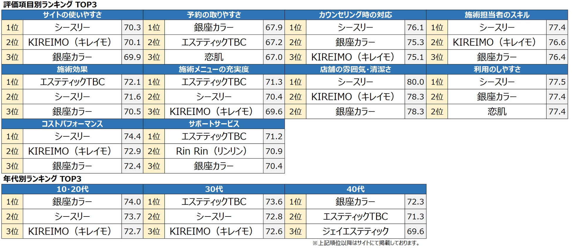 ・部門(全3項目):年代別「10・20代」「30代」「40代※」(※「脱毛サロン」のみ発表)