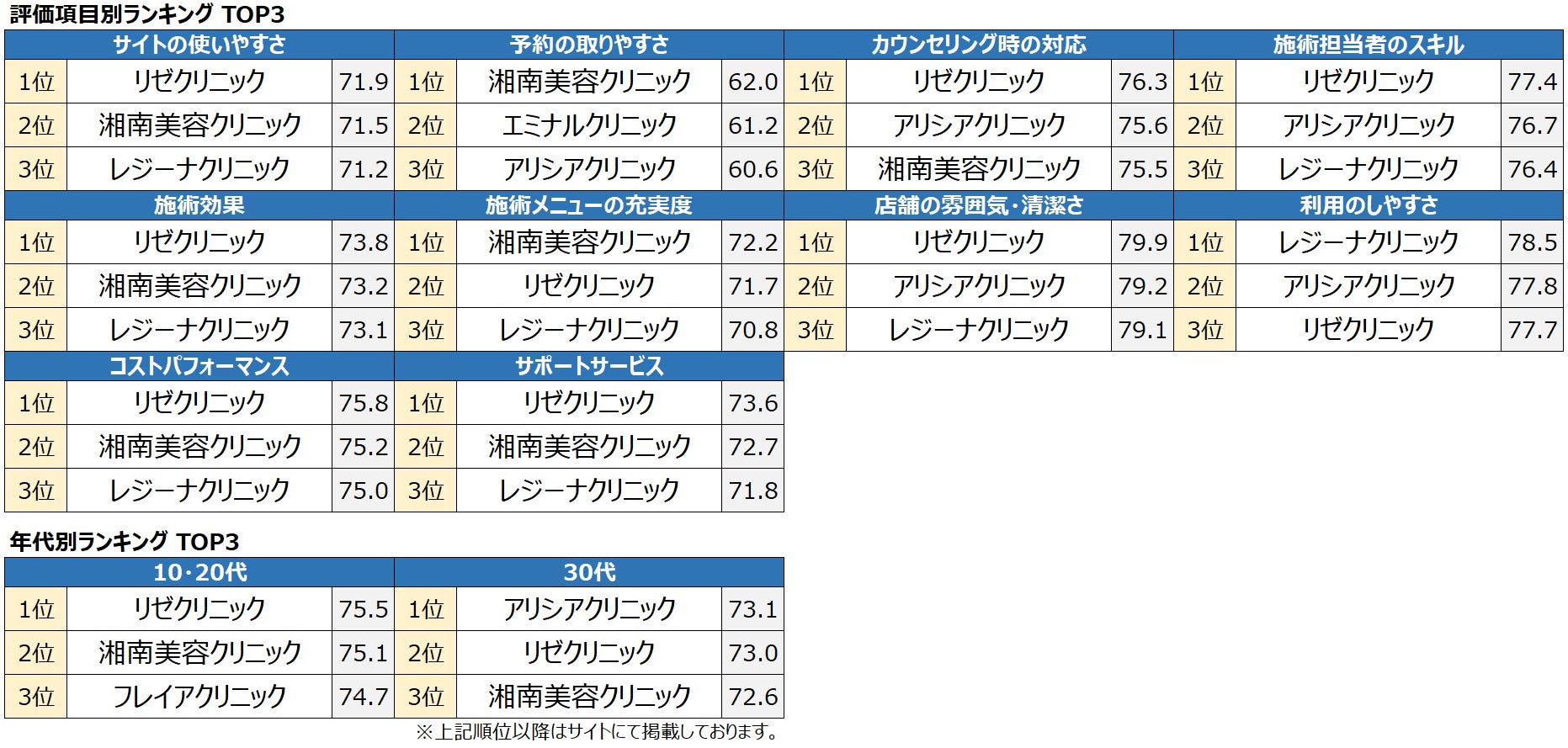 また総合2位の【湘南美容クリニック(SBC メディカルグループ 本社:東京都新宿区)】は、評価項目の「予約の取りやすさ」「施術メニューの充実度」の2項目で1位に。