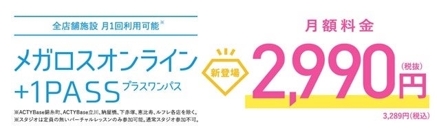 「オンライン+1(プラスワンパス)会員」はオンラインフィットネス「メガロスLEANBODY」の400本以上のオンデマンドレッスンと月200本以上のメガロスライブレッスンを受けることができ、かつ月1回、メガロス実店舗の利用が可能な会員プランです。本プランでは、月額2,990円(税抜)で、オンラインとオフライン両軸で、フィットネスプログラムを楽しんでいただくことができます。リニューアル後は、オンライン上ですべてのお申し込みが完結するようになったほか、月に1度の店舗利用を翌月に繰り越せるようになり、登録した店舗以外の全国のメガロス店舗(※1)の利用も可能になりました。