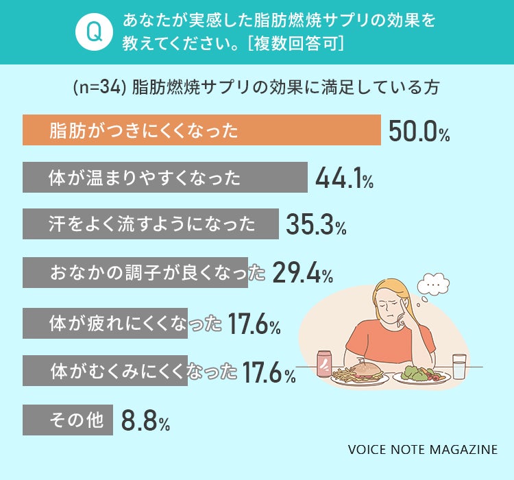 ここからは脂肪燃焼サプリを使用して、効果に満足したことのあるボイスノート会員34人に限定してアンケートを取りました!